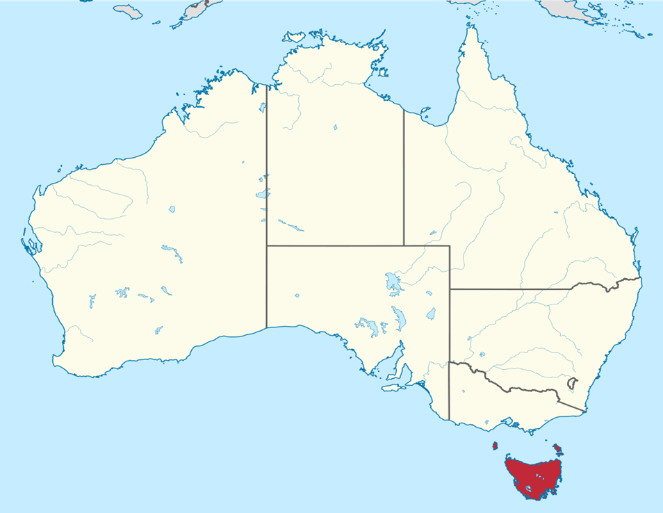 (Map of Australia, Red portion shows Tasmania; Image credit: By TUBS – This vector image includes elements that have been taken or adapted from this file:, CC BY-SA 3.0, https://commons.wikimedia.org/w/index.php?curid=16876432)